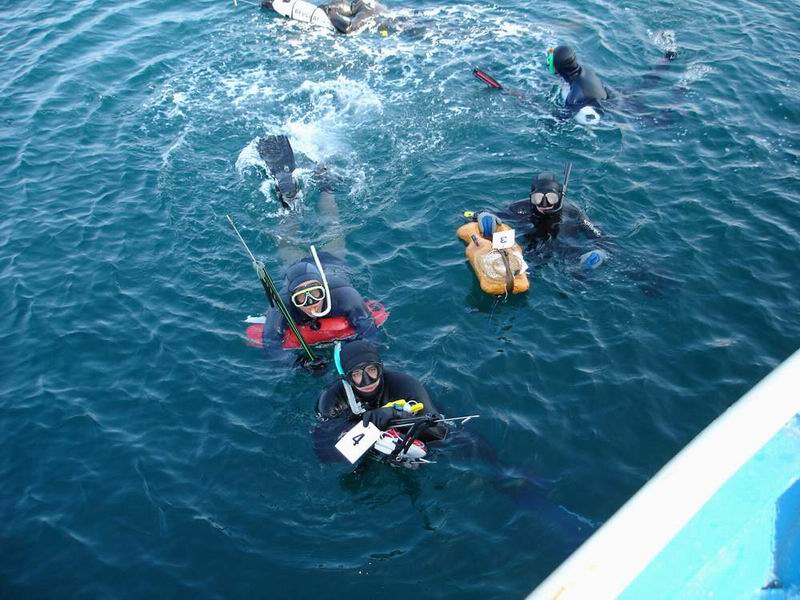 Второй день соревнований выдался солнечным с самого утра. На акватории были раньше положенного, поэтому старт решили дать раньше времени. 9.30, гудок "Саманты" и спортсмены понеслись к местам охоты, оставляя за собой пенистый след от ласт. Поняв, что за некоторыми охотниками я в своих не совсем длинных ластах не угонюсь, то решил продвигаться к намеченному месту ныряя. На грядах, поросших садами "бананов", проносились стаи зачетных рыб, включая крупных сайд. Началась охота. Подстрелив 5-6 штук, я понял, что сегодня у спортсменов будет намного больше рыбы, чем вчера. Чтобы превратить охоту из бойни в удовольствие, решил стрелять только крупные экземпляры. Достав карту, предварительно запаянную в полиэтилен и ознакомившись с расположением охотников, я обратил внимание на отмель, помеченную буем и находящуюся в стороне от островов. Я помчался туда, забравшись на буек. Встречное течение затрудняло продвижение вперед. Пройдя полпути, замечаю,что за мной организовалась погоня в лице прошлогоднего Чемпиона и нынешнего лидера испанца Joseba Kerejeta. Гонка продолжалась минут 20-30. К бую подплыл изрядно уставший. Двадцатиградусная температура воды на поверхности, так же осложняла работу сердца. Чуть отдышавшись, начинаю нырять. Продолжительность нырка все еще недостаточна. На второй нырок вижу очень крупную сайду, но задержки не хватает, чтобы подойти к ней на выстрел. Отдышавшись, начинает работать и испанец. Глубина варьируется от 6 метров до 24 и больше. Поднимаясь после очередного нырка, замечаю в стороне очень крупный экземпляр. Понимая, что пока буду делать гипервентяцию, рыба уйдет, чертыхаюсь, чувствуя своё бессилие. Вдруг, наперерез рыбе скользит силуэт испанца и исчезает в толще воды. Кажется, проходит вечность, прежде чем испанец показался на поверхности. Решив узнать результат единоборсва, подплываю к охотнику. На гарпуне билась крупная сайда, впоследствии потянувшая 4,5 кг! Мастер!