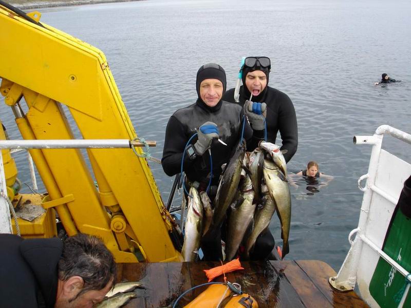 Подобрав нас, катер везет нас на другой участок, где мы могли бы поохотиться. На охоту отвели всего час. Но и этого оказалось достаточно. Найдя место охоты по предыдущей схеме, начинаю нырять. Кроме сайды стала попадаться и крупная треска. Схема охоты простая - осторожно падаешь на глубину 10 м и начинаешь высматривать рыбу , плавающую чуть ниже. Используя течение, подбираешься к ней почти не работая ластами. Стрелять лучше в голову. Так как нам много рыбы не надо, то стрелять с Доком решили только трофейные экземпляры. Рядом охотились и другие спортсмены, но всем хватало места. Время пролетело как одна минута. Док добыл сайду на 2,6 кг, а у меня такого же веса была треска. С рыбой вышли практически все. Взяли крупных сайд даже молодые охотники, которым было около 14 лет.