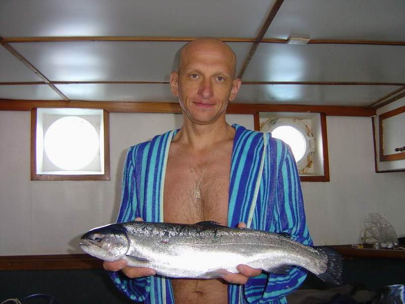 Утро было не оригиально - опять дождь. На этот раз, по-моему, затяжной. Пока дошли до места охоты, опять повторилась вчерашняя картина - небо прояснилось и выглянуло солнце. В 10 часов был дан старт. Время отведенное на охоту - 4 часа. Любое опаздание - дисквалификация. Спортсмены бросились на приглянувшиеся им места, но почему-то все поплыли в одну сторону. Решив быть оригинальным , поплыл в противоположную сторону, тем более , что кое-какую наводку получил от одного из наших спортсменов , охотившегося в этих местах ранее. Продвигаясь вдоль острова на глубине 10-13 м стал встречать небольших, но зачетных сайд. Но размер и их количество не устраивали меня, поэтому решил искать более привлекательные места. На соревнованиях время летит значительно быстрее, чем обычно. По истечении второго часа, нахожу подводную банку с обрывистыми склонами, уходящими на глубину 20 метров. Сильное течение и стаи небольших сайд подсказали что это то,что нужно. Нырок, выстрел и сайда на 1,5 кг на кукане. Но больше взять крупную рыбу не удалось, так как после пары промахов она ушла. Видимо, на этой банке уже кто-то поработал. В награду за упорство была встреча с лососем на 1,5 кг.