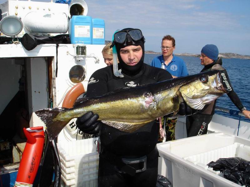 Так мы и работали на этой банке вдвоем. После первых наших нырков рыба ушла на глубины 17-20 метров. Но размеры трофеев стоили того, чтобы нырять на такую глубину. Чтобы добытая рыба не мешала нырять, кукан с ней повесил на буек. За час до окончании охоты, решаю потихоньку двигаться к точке сбора. Тот участок, который плыл 20 минут, обратно пролетел за 5 минут ( и это с куканом рыбы на буйке). Последнюю крупную сайду я взял в ста метрах от катера. Да, охота удалась. На кукане большую часть составляли крупные экземпляры сайды и трески, некоторые из которых достигали 4 кг.