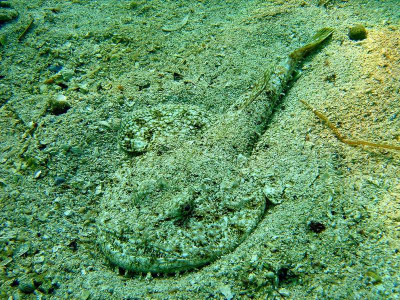 На глубине 8-10 м опять стала попадаться камбала. Долго позировать она не хотела, и после первого же снимка улепетывала во всю прыть. Опускаюсь еще ниже до 12-14 м. И тут ждет еще одна встреча с удивительным существом. Слившись с расцветкой дна, на нем проступают контуры большой головы с хвостом. Над головой колышется длинный отросток, которым рыба пытается подманить к своей пасти более мелких рыб. Это охотится удильщик. Прервав его охоту, за хвост поднимаю хищника на поверхность,чтобы лучше рассмотреть диковинную рыбу. Но удильщик посчитав, что это он поймал меня, пытается заглотить часть моей руки. От неожиданности отпускаю рыбу, предполагая, что она, освободившись, кинется на утек. Но я просчитался - отважная рыбешка,кажется, решается заглотить меня уже целиком. И это карапуз весом чуть более килограмма! А ведь удильщики достигают веса 70 кг! Передав наглеца Доку, отправляюсь на поиски гребешков. Только на глубине 19 м я встречаю первых моллюсков. Чтобы собрать достаточное их количетво для праздничного обеда приходилось нырять на глубину до 22 метров. Дополнить меню мы решили и крабами, которые встречались в более мелких местах.